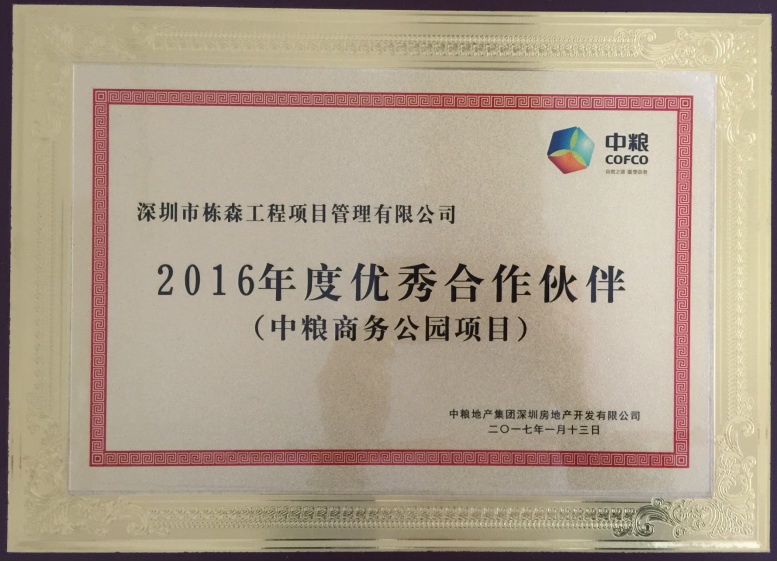 中糧地產集團深圳房地產開發有限公司2016年度優秀合作伙伴